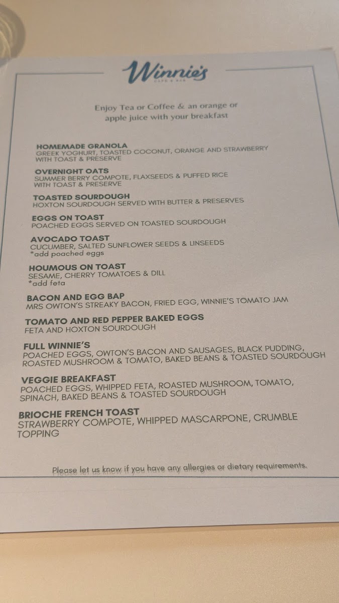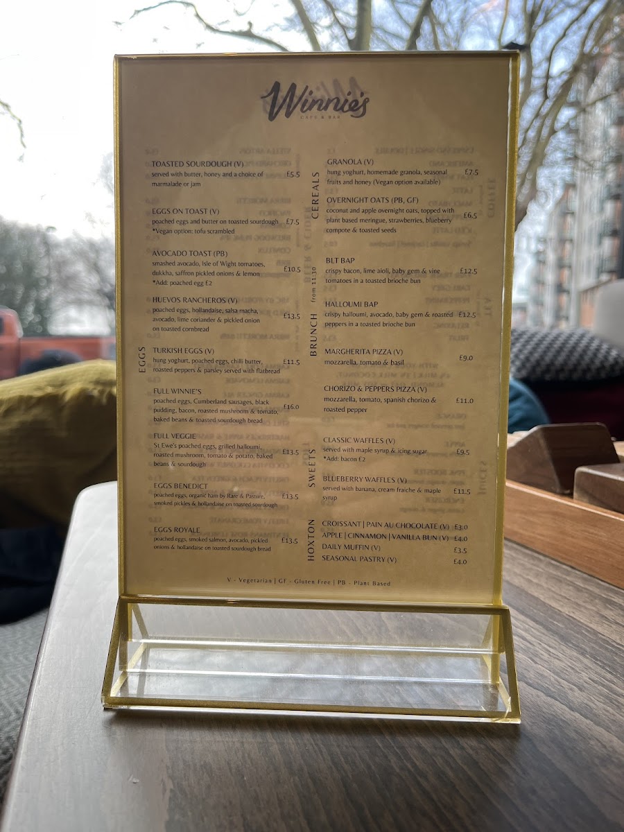 The menu at Winnie's Café and Bar at room2 Southampton offers a variety of options suitable for breakfast, brunch, and light meals throughout the day. It is divided into several categories to accommodate different tastes and dining occasions.